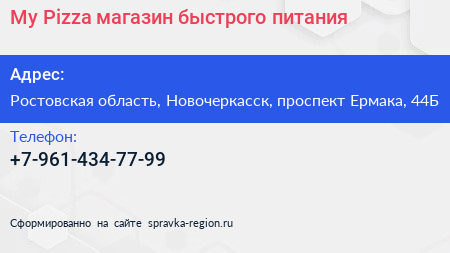 My Pizza, магазин быстрого питания по адресу Ростовская область, Новочеркасск, проспект Ермака, 44Б в дальнейшем Организация, размещена в следующих категориях: