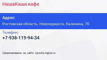 НашаКаша, кафе по адресу Ростовская область, Новочеркасск, Калинина, 70 в дальнейшем Организация, размещена в следующих категориях: