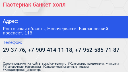 Пастернак, банкет-холл по адресу Ростовская область, Новочеркасск, Баклановский проспект, 118 в дальнейшем Организация, размещена в следующих категориях: