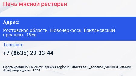 Печь, мясной ресторан по адресу Ростовская область, Новочеркасск, Баклановский проспект, 196а в дальнейшем Организация, размещена в следующих категориях: