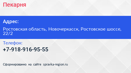 Пекарня по адресу Ростовская область, Новочеркасск, Ростовское шоссе, 22/2 в дальнейшем Организация, размещена в следующих категориях: