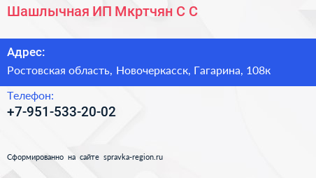 Шашлычная, ИП Мкртчян С.С. по адресу Ростовская область, Новочеркасск, Гагарина, 108к в дальнейшем Организация, размещена в следующих категориях: