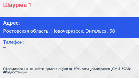 Шаурма №1 по адресу Ростовская область, Новочеркасск, Энгельса, 58 в дальнейшем Организация, размещена в следующих категориях: