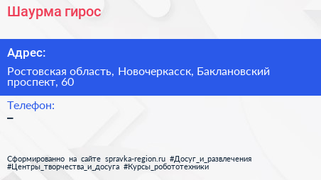 Шаурма & гирос по адресу Ростовская область, Новочеркасск, Баклановский проспект, 60 в дальнейшем Организация, размещена в следующих категориях: