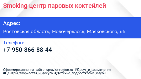 Smoking, центр паровых коктейлей по адресу Ростовская область, Новочеркасск, Маяковского, 66 в дальнейшем Организация, размещена в следующих категориях:
