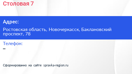 Столовая №7 по адресу Ростовская область, Новочеркасск, Баклановский проспект, 78 в дальнейшем Организация, размещена в следующих категориях: