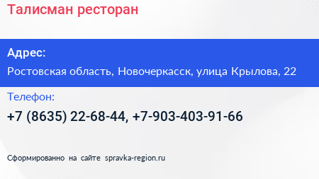 Талисман, ресторан по адресу Ростовская область, Новочеркасск, улица Крылова, 22 в дальнейшем Организация, размещена в следующих категориях: