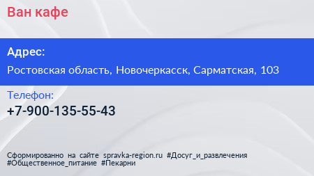 Ван, кафе по адресу Ростовская область, Новочеркасск, Сарматская, 103 в дальнейшем Организация, размещена в следующих категориях: