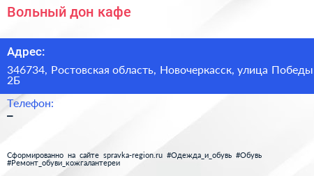Вольный дон, кафе по адресу 346734, Ростовская область, Новочеркасск, улица Победы, 2Б в дальнейшем Организация, размещена в следующих категориях: