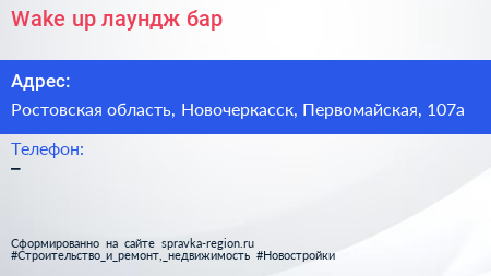 Wake up, лаундж-бар по адресу Ростовская область, Новочеркасск, Первомайская, 107а в дальнейшем Организация, размещена в следующих категориях: