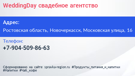 WeddingDay, свадебное агентство по адресу Ростовская область, Новочеркасск, Московская улица, 16 в дальнейшем Организация, размещена в следующих категориях: