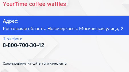 YourTime coffee & waffles по адресу Ростовская область, Новочеркасск, Московская улица, 2 в дальнейшем Организация, размещена в следующих категориях: