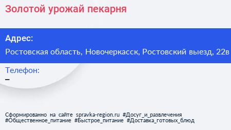 Золотой урожай, пекарня по адресу Ростовская область, Новочеркасск, Ростовский выезд, 22в в дальнейшем Организация, размещена в следующих категориях: