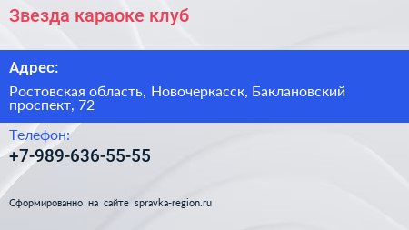 Звезда, караоке-клуб по адресу Ростовская область, Новочеркасск, Баклановский проспект, 72 в дальнейшем Организация, размещена в следующих категориях: