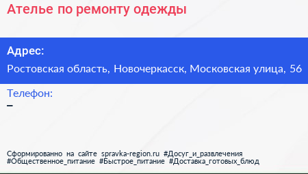 Ателье по ремонту одежды по адресу Ростовская область, Новочеркасск, Московская улица, 56 в дальнейшем Организация, размещена в следующих категориях: