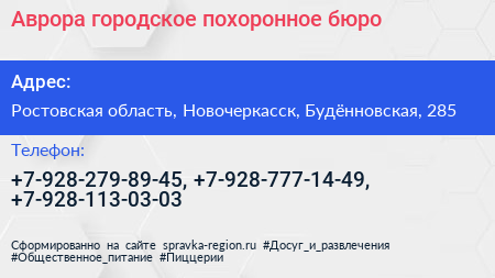Аврора, городское похоронное бюро по адресу Ростовская область, Новочеркасск, Будённовская, 285 в дальнейшем Организация, размещена в следующих категориях: