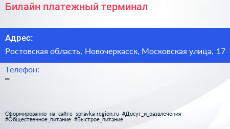 Билайн, платежный терминал по адресу Ростовская область, Новочеркасск, Московская улица, 17 в дальнейшем Организация, размещена в следующих категориях:
