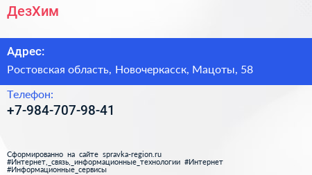 ДезХим по адресу Ростовская область, Новочеркасск, Мацоты, 58 в дальнейшем Организация, размещена в следующих категориях: