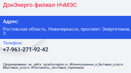 ДонЭнерго, филиал НчМЭС по адресу Ростовская область, Новочеркасск, проспект Энергетиков, 3 в дальнейшем Организация, размещена в следующих категориях: