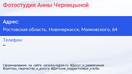 Фотостудия Анны Черницыной по адресу Ростовская область, Новочеркасск, Маяковского, 64 в дальнейшем Организация, размещена в следующих категориях: