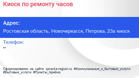 Киоск по ремонту часов по адресу Ростовская область, Новочеркасск, Петрова, 23а киоск в дальнейшем Организация, размещена в следующих категориях: