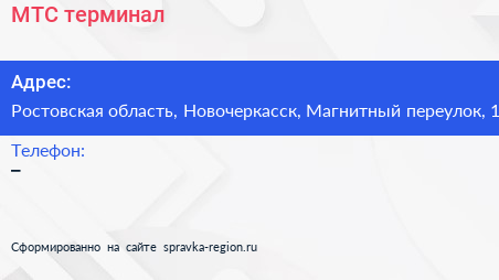 МТС, терминал по адресу Ростовская область, Новочеркасск, Магнитный переулок, 1 в дальнейшем Организация, размещена в следующих категориях: