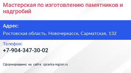 Мастерская по изготовлению памятников и надгробий по адресу Ростовская область, Новочеркасск, Сарматская, 132 в дальнейшем Организация, размещена в следующих категориях: