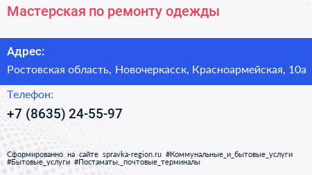 Мастерская по ремонту одежды по адресу Ростовская область, Новочеркасск, Красноармейская, 10а в дальнейшем Организация, размещена в следующих категориях: