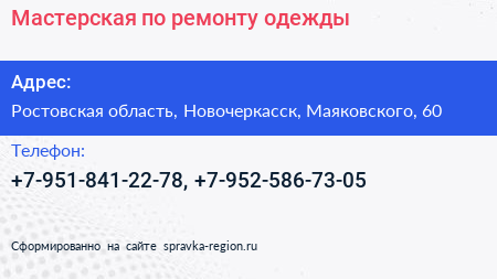 Мастерская по ремонту одежды по адресу Ростовская область, Новочеркасск, Маяковского, 60 в дальнейшем Организация, размещена в следующих категориях: