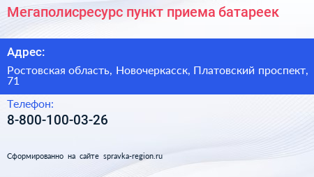 Мегаполисресурс, пункт приема батареек по адресу Ростовская область, Новочеркасск, Платовский проспект, 71 в дальнейшем Организация, размещена в следующих категориях: