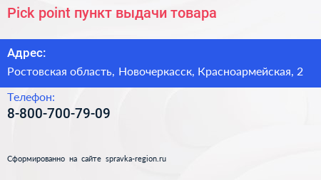 Pick point, пункт выдачи товара по адресу Ростовская область, Новочеркасск, Красноармейская, 2 в дальнейшем Организация, размещена в следующих категориях: