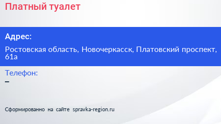 Платный туалет по адресу Ростовская область, Новочеркасск, Платовский проспект, 61а в дальнейшем Организация, размещена в следующих категориях: