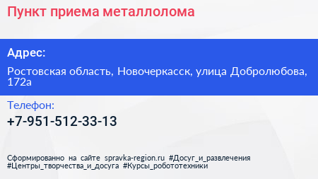 Пункт приема металлолома по адресу Ростовская область, Новочеркасск, улица Добролюбова, 172а в дальнейшем Организация, размещена в следующих категориях: