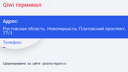 Qiwi, терминал по адресу Ростовская область, Новочеркасск, Платовский проспект, 77/1 в дальнейшем Организация, размещена в следующих категориях: