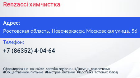 Renzacci, химчистка по адресу Ростовская область, Новочеркасск, Московская улица, 56 в дальнейшем Организация, размещена в следующих категориях: