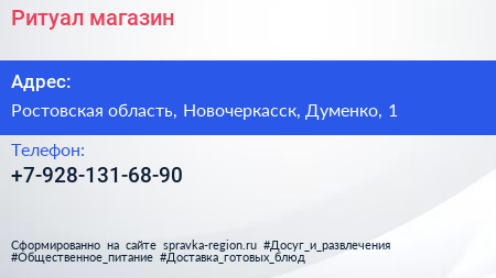 Ритуал, магазин по адресу Ростовская область, Новочеркасск, Думенко, 1 в дальнейшем Организация, размещена в следующих категориях: