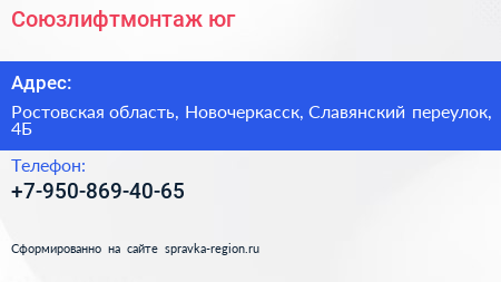 Союзлифтмонтаж-юг по адресу Ростовская область, Новочеркасск, Славянский переулок, 4Б в дальнейшем Организация, размещена в следующих категориях: