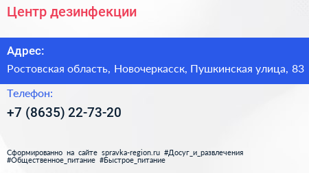 Центр дезинфекции по адресу Ростовская область, Новочеркасск, Пушкинская улица, 83 в дальнейшем Организация, размещена в следующих категориях: