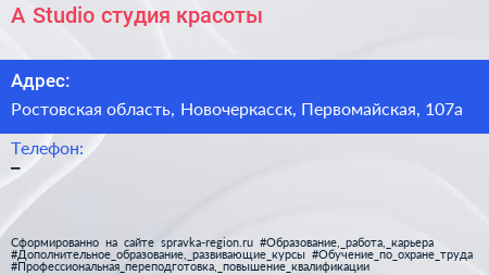 A-Studio, студия красоты по адресу Ростовская область, Новочеркасск, Первомайская, 107а в дальнейшем Организация, размещена в следующих категориях:
