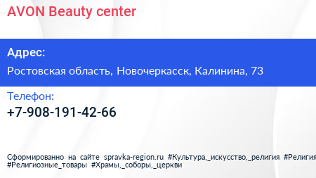AVON Beauty center по адресу Ростовская область, Новочеркасск, Калинина, 73 в дальнейшем Организация, размещена в следующих категориях: