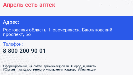 Апрель, сеть аптек по адресу Ростовская область, Новочеркасск, Баклановский проспект, 56 в дальнейшем Организация, размещена в следующих категориях: