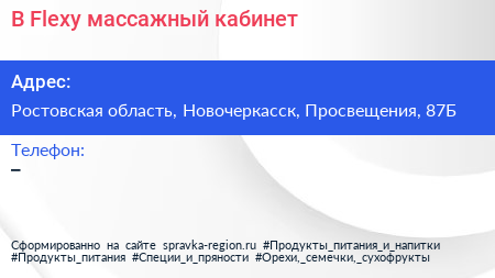B-Flexy, массажный кабинет по адресу Ростовская область, Новочеркасск, Просвещения, 87Б в дальнейшем Организация, размещена в следующих категориях: