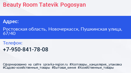 Beauty Room Tatevik Pogosyan по адресу Ростовская область, Новочеркасск, Пушкинская улица, 67/40 в дальнейшем Организация, размещена в следующих категориях: