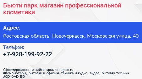 Бьюти парк, магазин профессиональной косметики по адресу Ростовская область, Новочеркасск, Московская улица, 40 в дальнейшем Организация, размещена в следующих категориях: