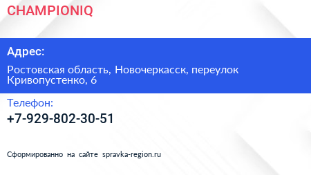 CHAMPIONIQ по адресу Ростовская область, Новочеркасск, переулок Кривопустенко, 6 в дальнейшем Организация, размещена в следующих категориях: