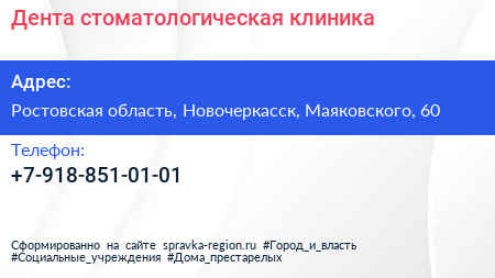 Дента, стоматологическая клиника по адресу Ростовская область, Новочеркасск, Маяковского, 60 в дальнейшем Организация, размещена в следующих категориях: