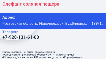 Элефант, соляная пещера по адресу Ростовская область, Новочеркасск, Будённовская, 189/1а в дальнейшем Организация, размещена в следующих категориях: