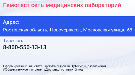 Гемотест, сеть медицинских лабораторий по адресу Ростовская область, Новочеркасск, Московская улица, 69 в дальнейшем Организация, размещена в следующих категориях: