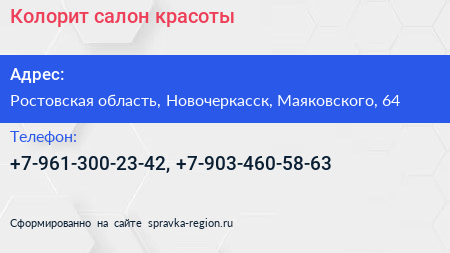 Колорит, салон красоты по адресу Ростовская область, Новочеркасск, Маяковского, 64 в дальнейшем Организация, размещена в следующих категориях: