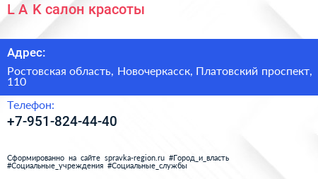 L.A.K., салон красоты по адресу Ростовская область, Новочеркасск, Платовский проспект, 110 в дальнейшем Организация, размещена в следующих категориях: